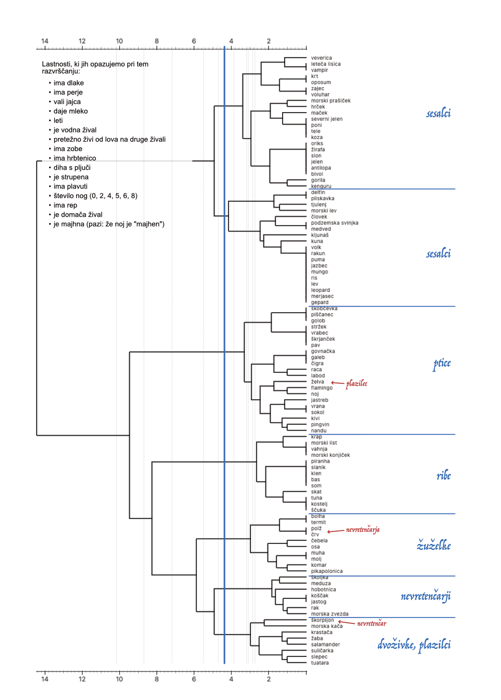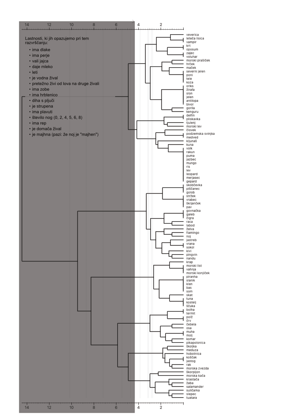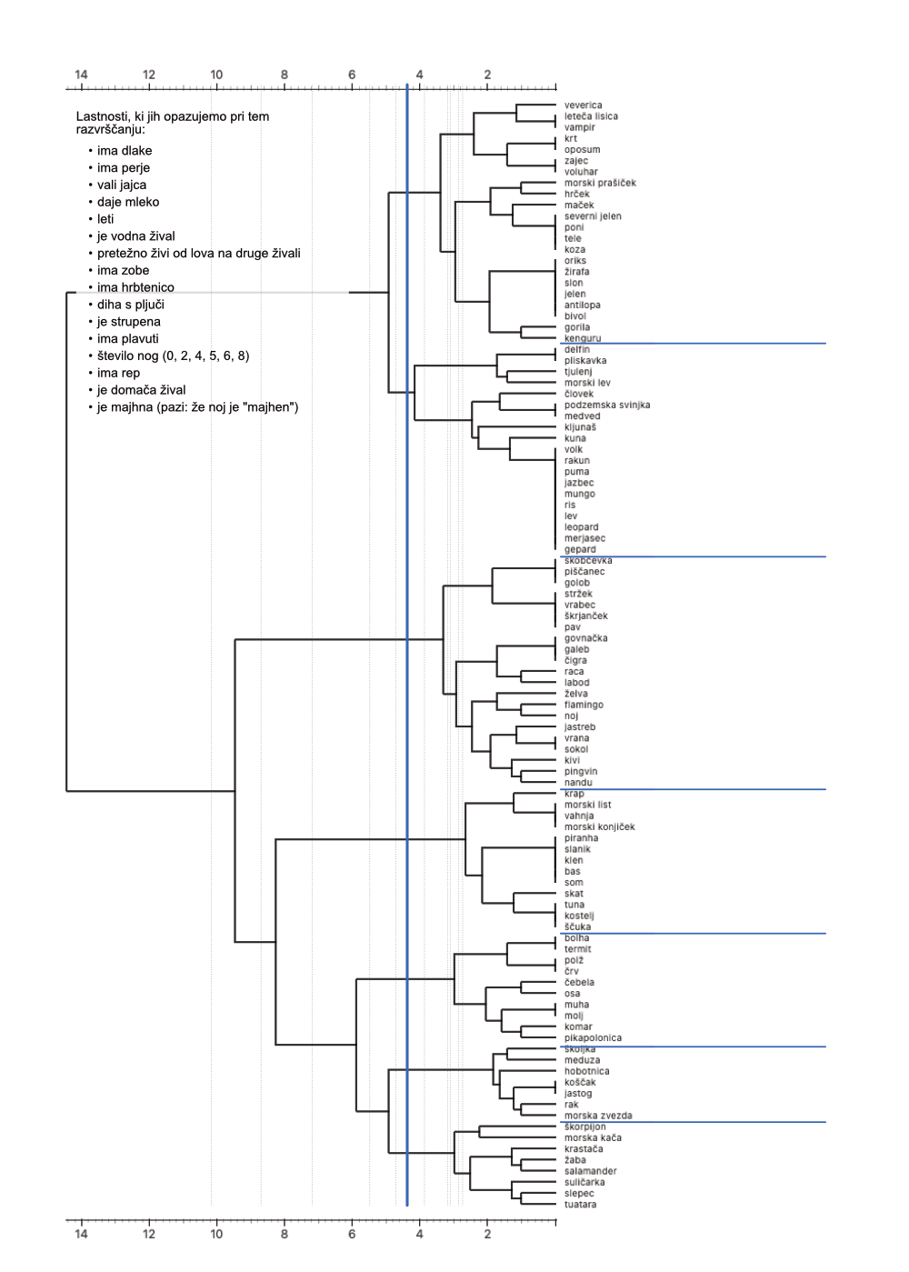 Skupine naj označijo prag, pri kateri so razdelili skupine živali. Dobljene skupine živali naj ločijo z vodoravnimi črtami.