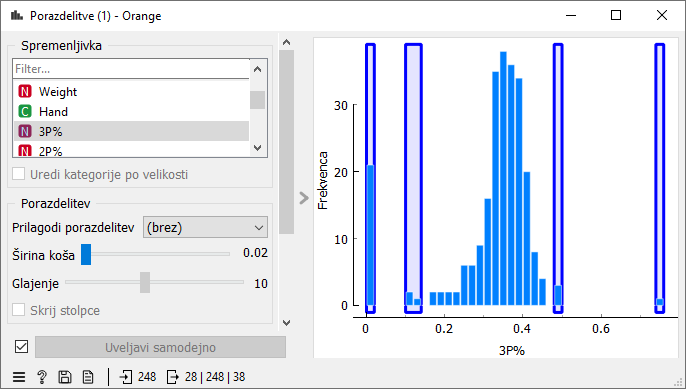 Če si sedaj ogledamo distribucijo natančnosti igralcev pri metih za 3 točke, bomo opazili, da je povprečje nekje med 30% in 40%. Nekaj igralcev pa ima to povprečje izrazito nižje ali višje. Pri nižjih povprečjih lahko preverimo, da gre za igralce na centerskih pozicijah, ki se za te mete ne odločajo ali so pri njih manj uspešni. Med tistimi z višjim povprečjem pa so najbrž igralci, ki so vrgli manj trojk, vendar bili zelo uspešni. Eden od njih je tudi Vlatko Čančar.