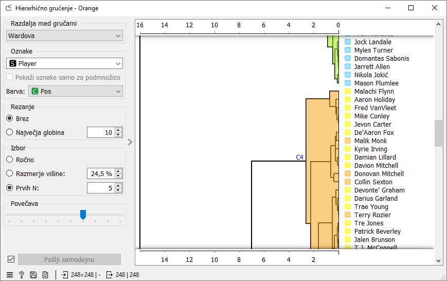 V dendrogramu (vizualizaciji hierarhičnega gručenja) vidimo nekaj čistih skupin, kjer večina igralcev pripada isti igralni poziciji. Na zgornji sliki vidimo skupino, ki vključuje predvsem organizatorje igre in nekatere branilce. Nad njo je viden del skupine z večinoma centri. Nekatere skupine pa so še vedno precej mešane. Bi bile skupine boljše, če bi vključili več atributov namesto samo izbranih dveh (višine in natančnosti za dve točki)? Ni nujno. Z dodajanjem nekoristnih atributov vplivamo na mere razdalj in posledično na odkrite skupine.