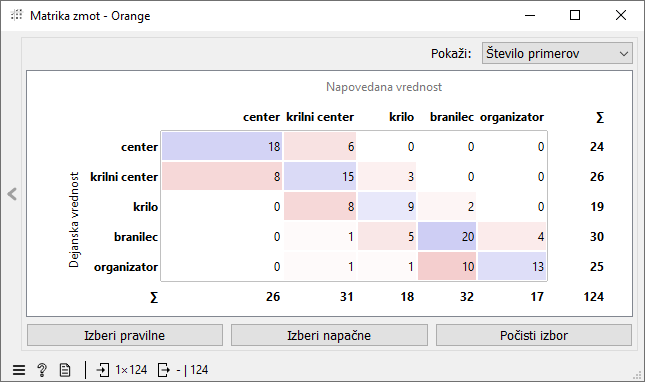 60% natančnost se ne sliši prav dobro, vendar naš način ugibanja oz. napovedovanja ni tako slab. Niso namreč vse napake enake. Če postavimo igralca namesto na pozicijo organizatorja raje pod koš na pozicijo centra, je to precej večja napaka kot če organizatorja zamenjamo z branilcem. V matriki zmot vidimo, kakšne napake je delal naš klasifikator. Kdaj je zamenjal centra za krilnega centra, zelo radikalnih napak pa ni počel. Največja napaka je bila, da je enega igralca, ki je sicer organizator igre, postavil na pozicijo krilnega centra. To je bil prav Luka Dončić, ki je nenavadno velik za organizatorja igre v NBA.