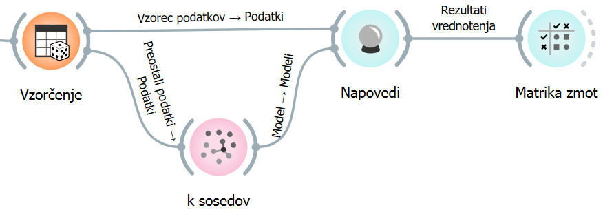 Podatke bomo razdelili na dva enako velika dela (Vzorčenje). V enem delu bomo poskusili uganiti igralne pozicije, drugega pa bomo pri tem uporabljali za iskanje podobnih igralcev. Če se omejimo samo na najbolj podobnega igralca (Število sosedov = 1), lahko v gradniku Napovedi vidimo, da s takim postopkom pravilno uganemo igralne pozicije 53% igralcev (Klasifikacijska točnost, Točnost=0.532). Z malo eksperimentiranja ugotovimo, da so s 5 najbolj podobnimi igralci rezultati še boljši, z 10 pa že presežemo natančnost 60%. Je smiselno to število sosedov še povečevati, morda kar na 100 ali pa 200? Žal ne.