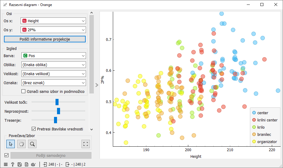 Poskusimo poiskati skupine igralcev glede na njihove igralne pozicije. Pretvarjajmo se, da ne poznamo igralnih pozicij in jih poskusimo čim bolje določiti iz preostanka podatkov. V razsevnem diagramu bi radi poiskali par atributov, da bodo igralci na istih pozicijah čim bolj skupaj. Če npr. izberemo odstotek zadetih prostih metov (FT%) in povprečno število točk na tekmo (PTS), dobimo sliko, kjer so igralci na različnih pozicijah povsem pomešani med seboj. Ta dva atributa nam torej ne povesta kaj dosti o igralnem mestu, ker imajo npr. visoko število točk in odstotek zadetih prostih metov lahko tako centri, organizatorji igre ali drugi igralci. Preverili bi lahko vse možne kombinacije atributov z uporabo funkcije Poišči informativne projekcije, ali pa uporabimo nekaj svojega znanja o košarki. Na spodnji sliki vidimo razpored igralcev glede na višino (Height) in odstotek zadetih metov za dve točki (2P%).