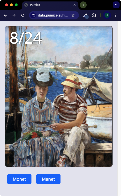 Pred uro na strani https://data.pumice.si/razvrscanje#monet-manet pripravimo obrazec za vnos podatkov: izberemo “Monet in Manet”, kliknemo na gumb “Pripravi stran za aktivnost” in dobimo povezavo, na primer https://data.pumice.si/soba-hamburger.