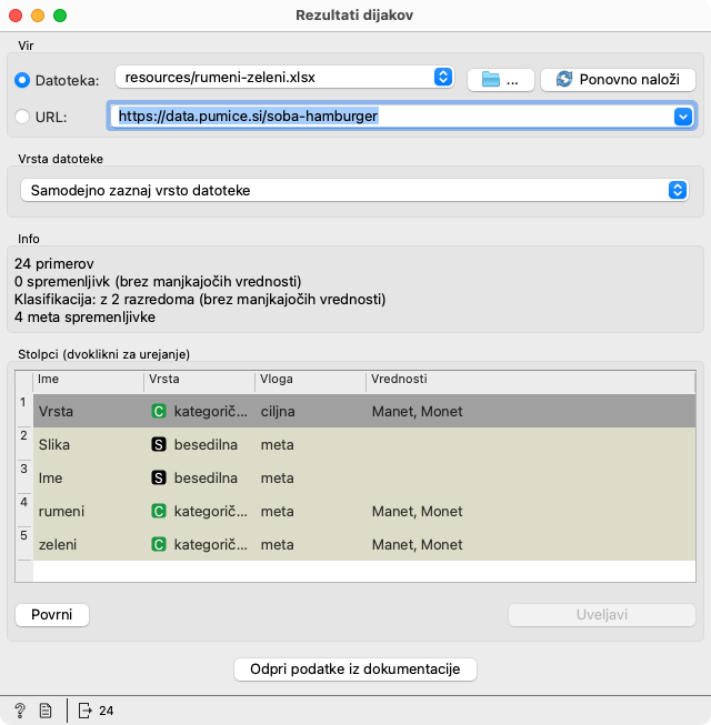 V Orangeu dvokliknemo gradnik Rezultati dijakov in nastavimo URL: če so dijaki za vnos uporabili povezavo https://data.pumice.si/soba-hamburger, bo URL za rezultate https://data.pumice.si/soba-hamburger/data.