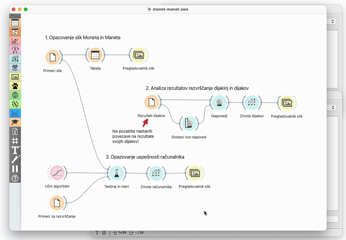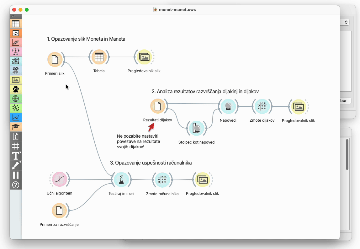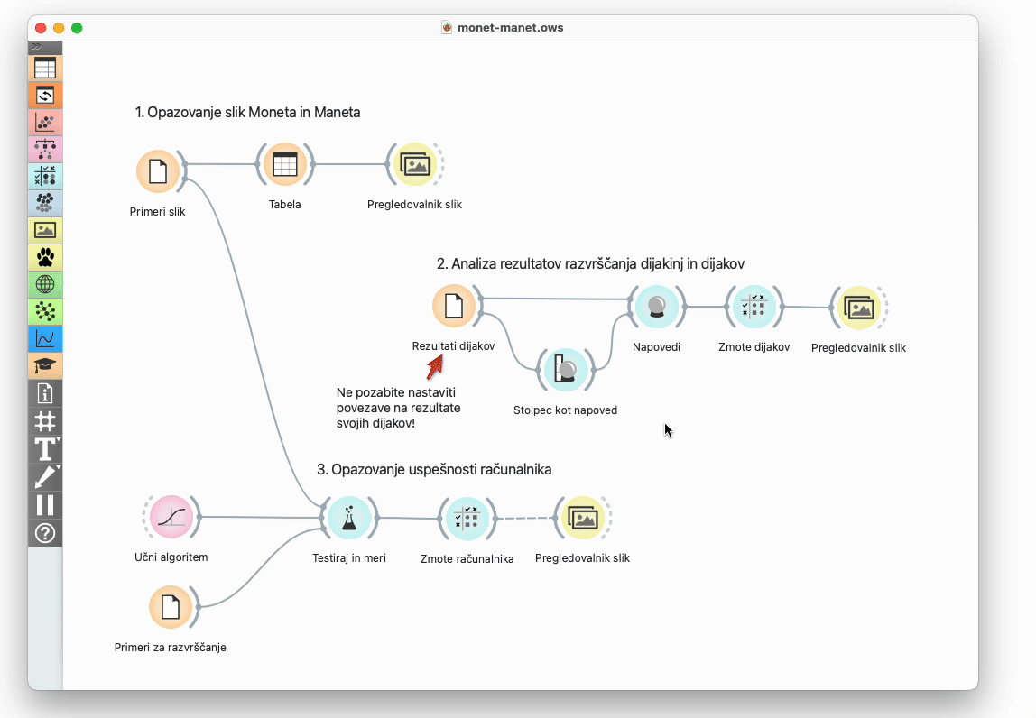 Predvideni potrebni gradniki Orangea: Uvoz slik, Vložitev slik, Testiraj in meri, Logistična regresija, Matrika zmot, Pregledovalnik slik, Tabela