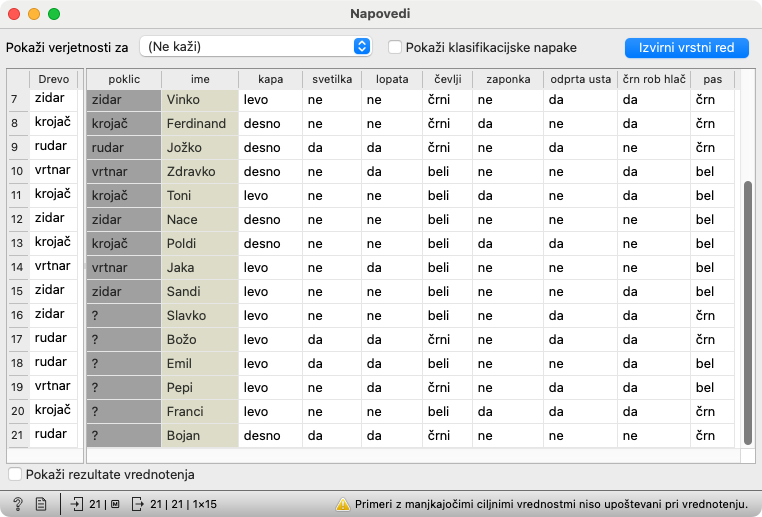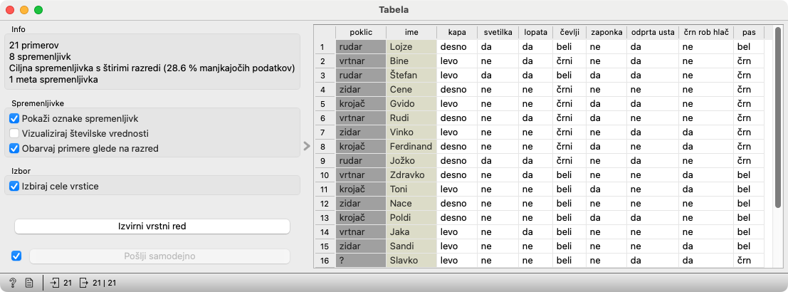 Z dvoklikom odpremo gradnik Tabela, da učencem pokažemo podatke, s katerimi bo delal računalnik. To je pomembno zato, da vidijo, da vsebujejo tudi nepomembne lastnosti, kot so barva pasu, čevljev in oblika kape. Videli bomo, ali ga bodo zavedle ali ne.