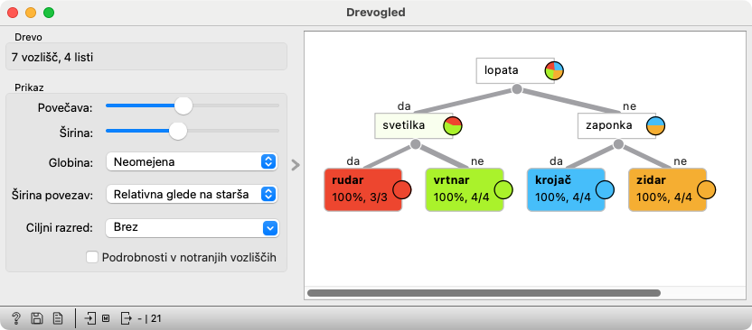 Iz slik palčkov smo tako izluščili splošen vzorec, pravilo. Posamičnih slik zdaj sploh ne potrebujemo več, saj model (drevo) vsebuje vse, kar je potrebno.