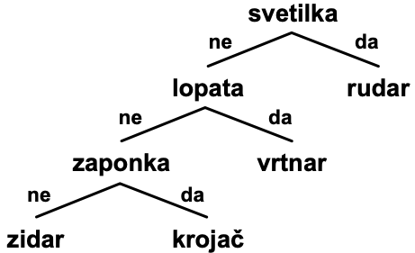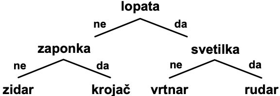 Končni rezultat bo najbrž eno od spodnjih dveh dreves. Če namreč začnemo s svetilko ali lopato, to že določi, kakšne so smiselne naslednje delitve.