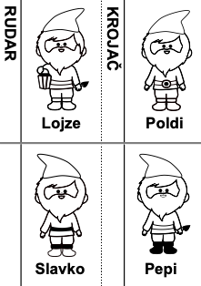 Razredu pokažemo sliki palčkov Lojzeta in Poldija: Lojze je rudar in Poldi je krojač. Nato jim pokažemo Slavka in Pepija. (V gradivu so tudi slike Zdravka, Gvida, Jožka, Vinka, Jaka in Sandija. Teh jim še ne kažemo, na vrsto bodo prišli kasneje!) Vprašanje je: kaj sta Slavko in Pepi?