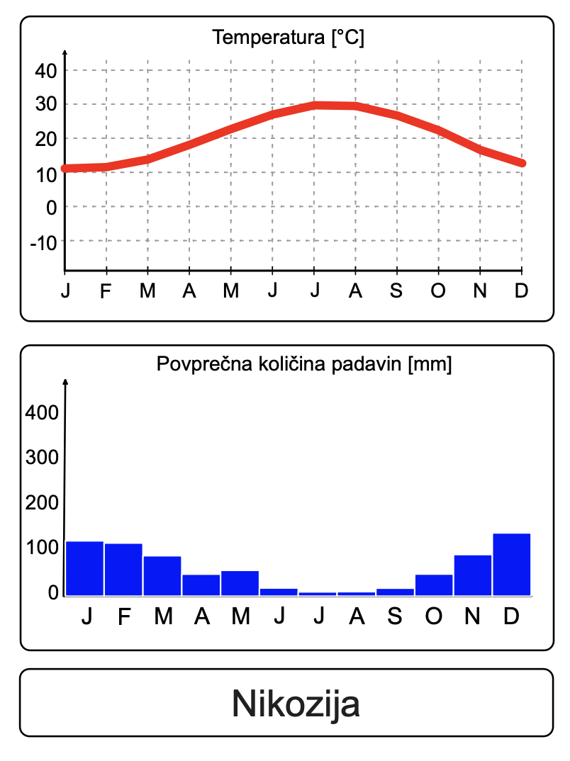 Pokažemo klimogram Nikozije in vprašamo, kateremu od gornjih treh je najbolj podoben. Najbolj podoben je Lizboni, saj ima suho poletje. Razlikujeta se sicer po tem, da ima Lizbona pozimi več padavin in je poleti nekoliko hladnejša, vendar je letni potek - predvsem padavin - zelo podoben.