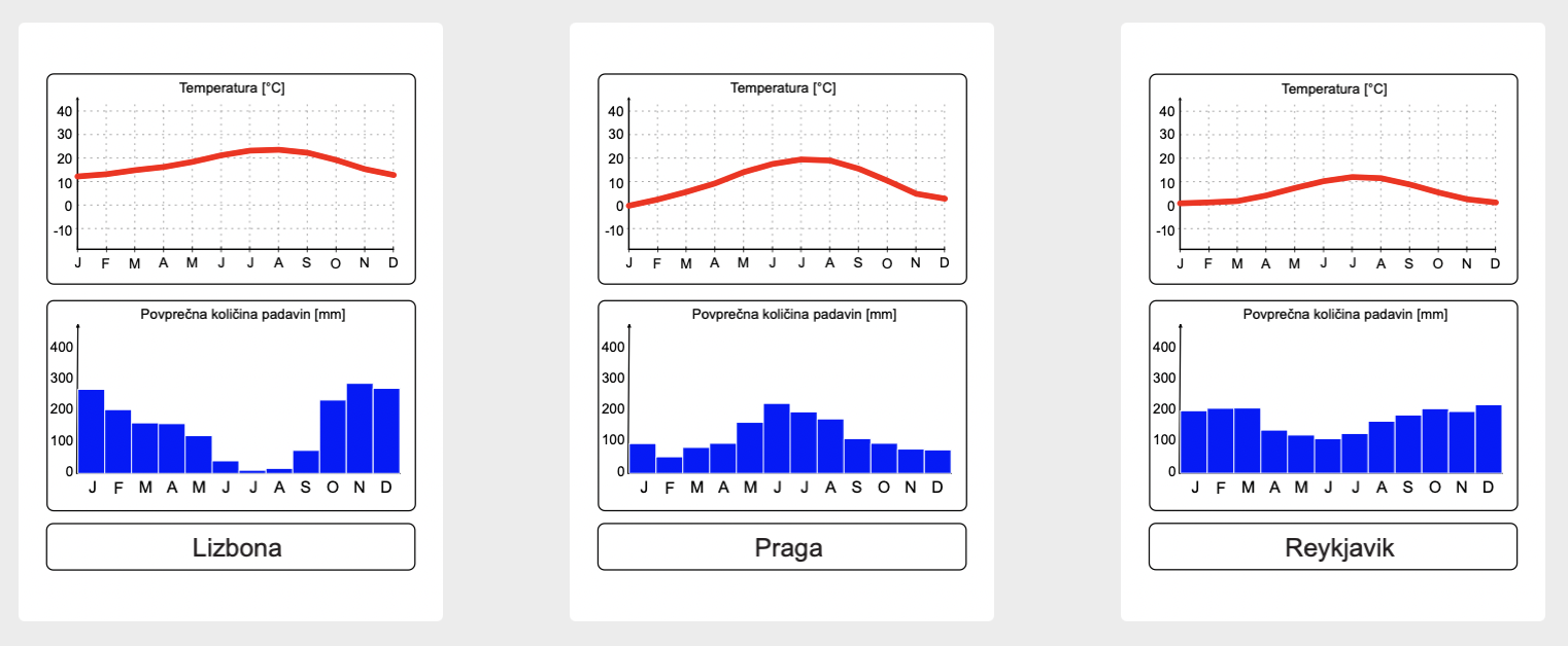 Z učenci obnovimo, kako brati klimogram. Če ga še niso videli, ga lahko tudi razložimo, saj ni zapleteno. :) Za primer uporabimo velike klimograme Lizbone, Prage in Reykjavika. Pogovorimo se o tem, kje je pozimi hladno, kje poleti vroče (in kje ne), ter kako je s padavinami.