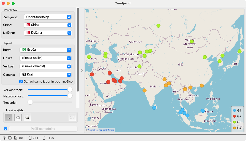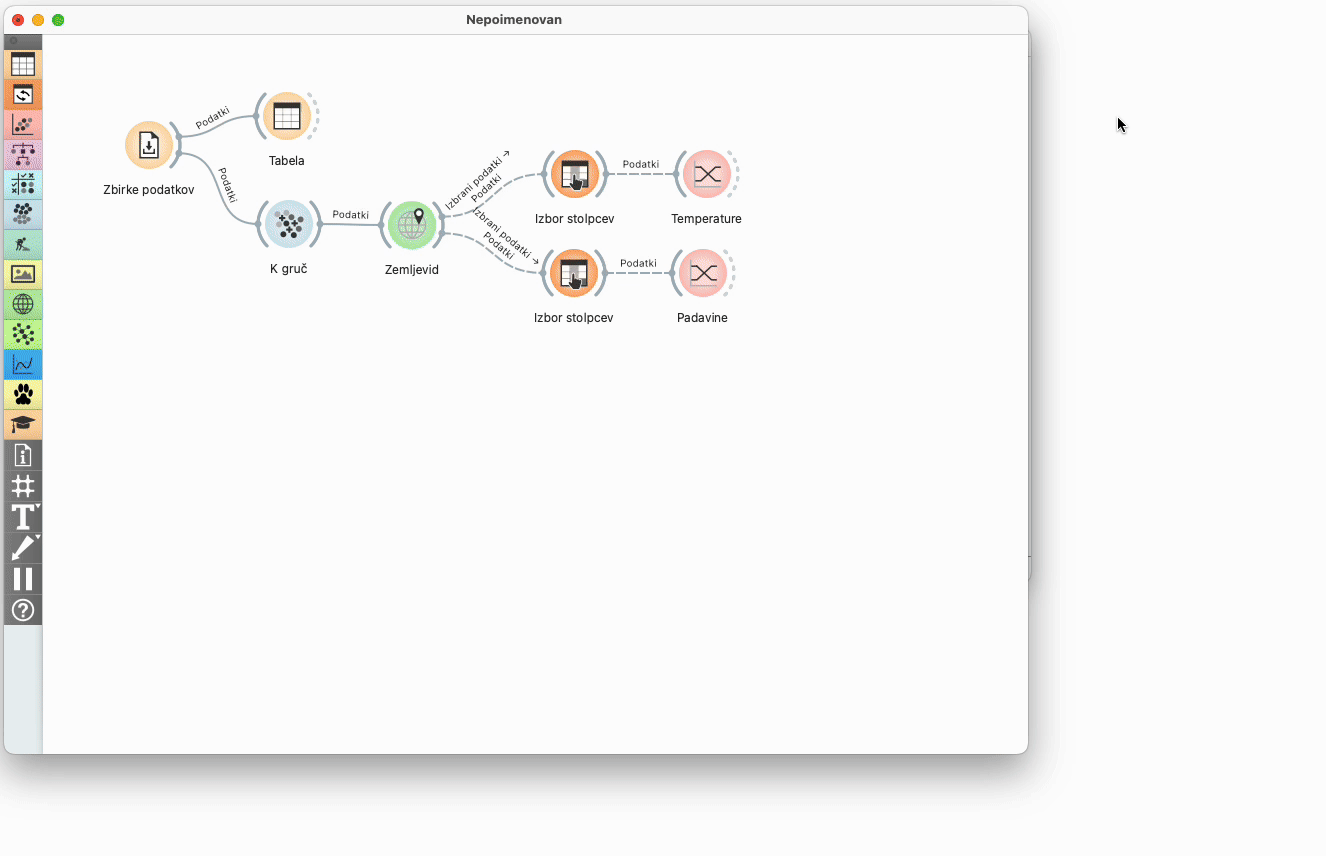 Z dvoklikom odpremo gradnik Zemljevid. Pokazal bo, kako je računalnik razvrstil kraje v štiri gruče. Vsaka gruča je označena z drugo barvo, tako kot so to storili učenci.