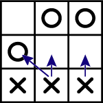 Slika kaže poteze, ki jih lahko naredi igralec po tem, ko nasprotnik premakne naprej levi krožec: srednji in desni križec se lahko premakneta naprej, poleg tega pa lahko srednji križec vzame krogec levo spredaj. Levi križec se ne more premakniti.