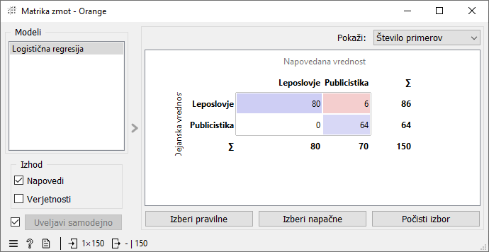 Logistična regresija se občasno tudi zmoti. Njene napake lahko raziščemo v gradniku Matrika zmot. V diagonalnih poljih, obravanih z modro, so pravilno napovedani primeri. Izven diagonale pa so primeri, ki jih je model napačno napovedal. Vidimo, da se je logistična regresija zmotila zgolj pri leposlovnih besedilih. Za 6 leposlovnih besedil je namreč menila, da so publicistična.