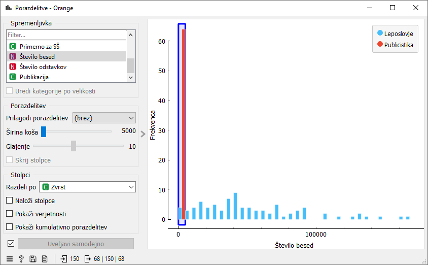 Podatke naložimo v Corpus. V okvirčku Used text features mora biti samo Vsebina, vse ostalo pa v Ignored text features. Nato Corpus povežemo z gradnikom Porazdelitve. Tam kot spremenljivko izberemo število besed, podatke pa delimo glede na zvrst. Tako lahko vidimo, na primer, katera besedila so daljša in katera krajša.