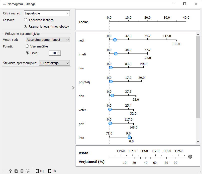 Naš model lahko pogledamo v gradniku, ki se imenuje Nomogram. Ta nam pokaže, katere besede so značilne za leposlovna besedila in katere za publicistična. Višje v nomogramu je beseda, bolj je pomembna za razlikovanje med tipi besedil. Pomembno je tudi, v katero smer je obrnjena x os. Če so višje številke na desni, potem to pomeni, da pogostejša kot je beseda, bolj verjetno bo dokument pripadal izbranemu tipu (v našem primeru leposlovju). In obratno, če številke proti desni padajo, potem redkejša kot je beseda, bolj verjetno bo dokument tega tipa.