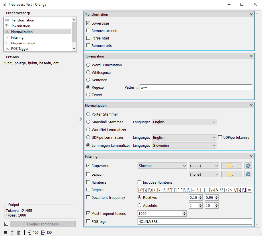 Oblak besed lahko “popravimo”. Računalniku povemo, katerih delov besedila naj ne upošteva. Na primer, lahko odstranimo vsa ločila in nepolnopomenske besede (tem rečemo preprosteje odvečne besede). To storimo z gradnikom Preprocess Text, kjer nastavimo postopek tako, kot smo ga opisali zgoraj. Torej besede pretvorimo v malo začetnico (transformation –> lowercase), razbijemo besedila na besede (tokenization –> regexp) ter odstranimo nepolnopomenske besede (filtering –> stopwords). Pri tem pazimo, da pri izbiri jezika vedno izberemo slovenščino (Slovenian, Slovene). Rezultate vsakega koraka opazujemo v gradniku Word Cloud.