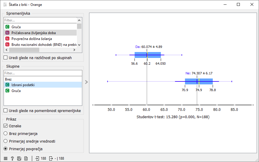 Če namesto tega razdelimo celoten svet na gruče (s klikom izven gruče), vidimo, po čem se najbolj razlikujejo gruče. Lahko pa izberemo dve skupini (kliknemo znotraj ene, nato pa pritisnemo Shift in kliknemo znotraj druge skupine) in potem opazujemo razlike med tema skupinama. Za to je prikladneje, če dvokliknemo povezavo med hierarhičnim gručenjem in škatlo z brki ter ponovno izberemo samo Izbrani podatki, da v škatlo z brki ne pridejo preostale, neizbrane države. Tako lahko vidimo, na primer, kakšna je razlika med zahodno- in vzhodnoevropsko skupino.