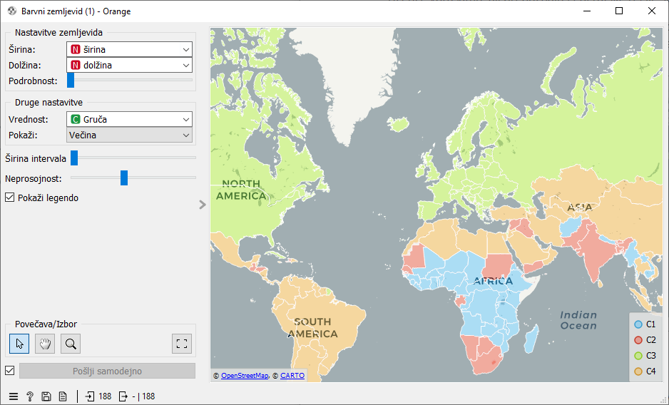 Hierarhično gručenje povežemo z Barvnim zemljevidom. Za “Vrednost” izberemo “Gruča”, “Prikaži” pa naj bo “Večina”. Tako bo vsaka država obarvana glede na gručo, ki ji pripada.