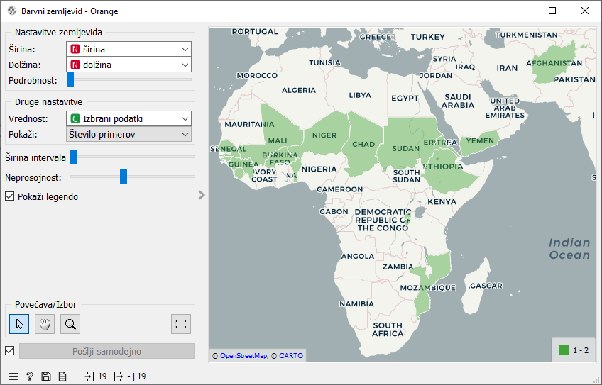 Gradnik Porazdelitve povežemo s Tabelo in z Barvnim zemljevidom. Če zdaj izbiramo podatke v Porazdelitve, se izbrane države pokažejo v tabeli in na zemljevidu. Tole so države, v katerih se v poprečju šolajo manj kot štiri leta.