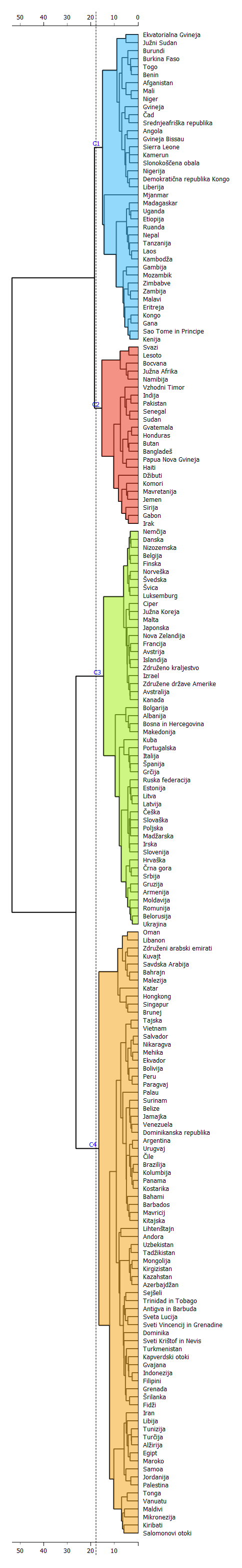 V hierarhičnem gručenju lahko izbiramo različna števila gruč in opazujemo, kako svet bolj ali manj podrobno razdelimo glede na razvitost.