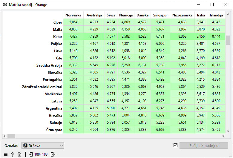 V Orangeu izračunamo razdalje z gradnikom Razdalje (primerna nastavitev za te podatke: Vrstice, Evklidska (normalizirana)). Ta izračuna matriko razdalj med vsemi pari objektov, na primer vrstic. Razdalje lahko opazujemo z gradnikom Matrika razdalj. Če nastavimo oznake na Country, bodo vrstice in stolpci označeni z imeni držav. Tako lahko vidimo, na primer, da je razlika med Katarjem in Nemčijo bistveno večja od razlike med Nemčijo in Poljsko.