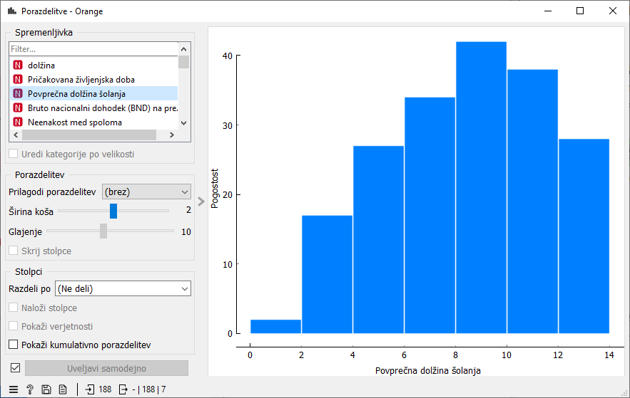 Ko so podatki naloženi v Orange, jih povežemo v gradnik Porazdelitve. (Učenci lahko temu sledijo zgolj frontalno in začnejo uporabljati računalnike kasneje.) Izberemo podatek “Povprečna dolžina šolanja” in nastavimo širino koša na 2 leti.