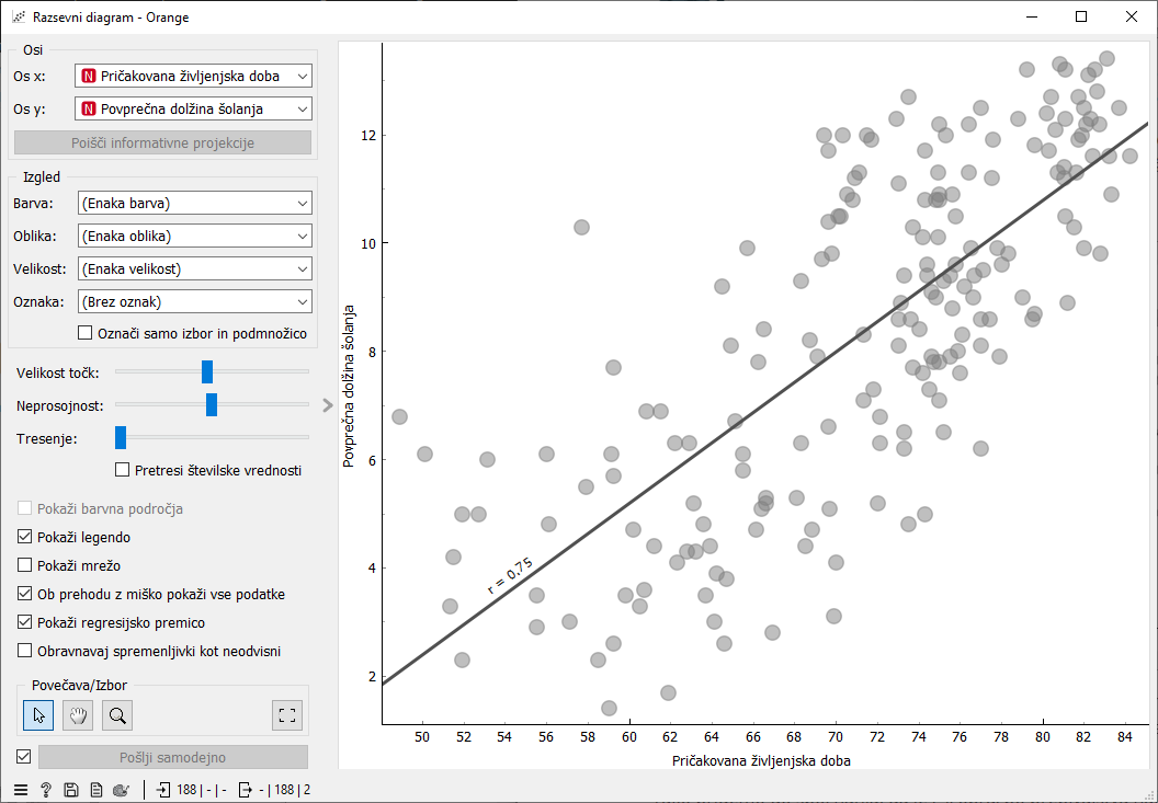 Za ilustracijo povezanosti dolžine šolanja s kvaliteto življenja pokažemo razsevni diagram, v katerem položaj vzdolž vodoravne koordinate ustreza dolžini šolanja, položaj vzdolž navpične pa pričakovani življenjski dobi. Dodamo lahko tudi regresijsko premico, da vidimo trend.