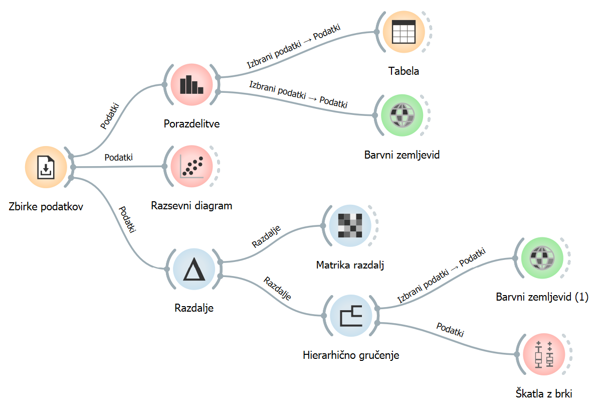 Predvideni potrebni gradniki Orangea: Zbirke podatkov, Tabela, Porazdelitve, Razdalje, Hierarhično gručenje, Barvni zemljevid, Škatla z brki