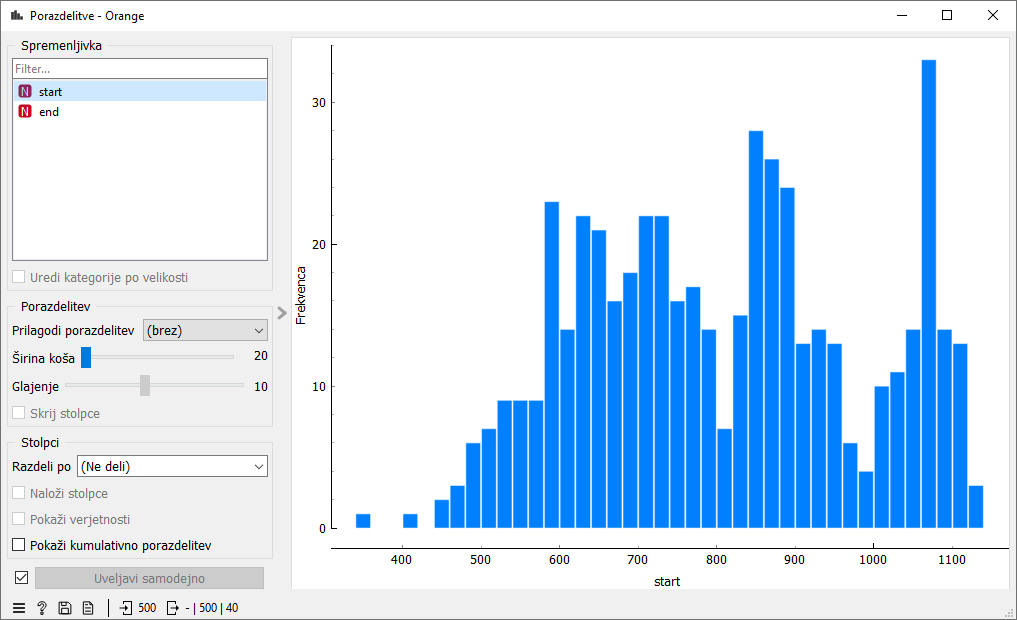 Iz te distribucije pa že lahko razberemo nekaj značilnosti. Obstajajo tri izrazite skupine začetkov rezervacij. Prva skupina je nekje na območju med 500 in 800, druga skupina okoli 900, zadnja pa okoli 1100-te minute. Če to pretvorimo v ure je prva skupina dopoldanska in predstavlja obdobje med 8. in 13. uro. Nato najbrž sledi kosilo. Druga skupina je popoldanska z začetki okoli 15. ure in zadnja večerna okoli 18. ure. Če si ogledamo distribucijo koncev, pridemo do podobnega zaključka.