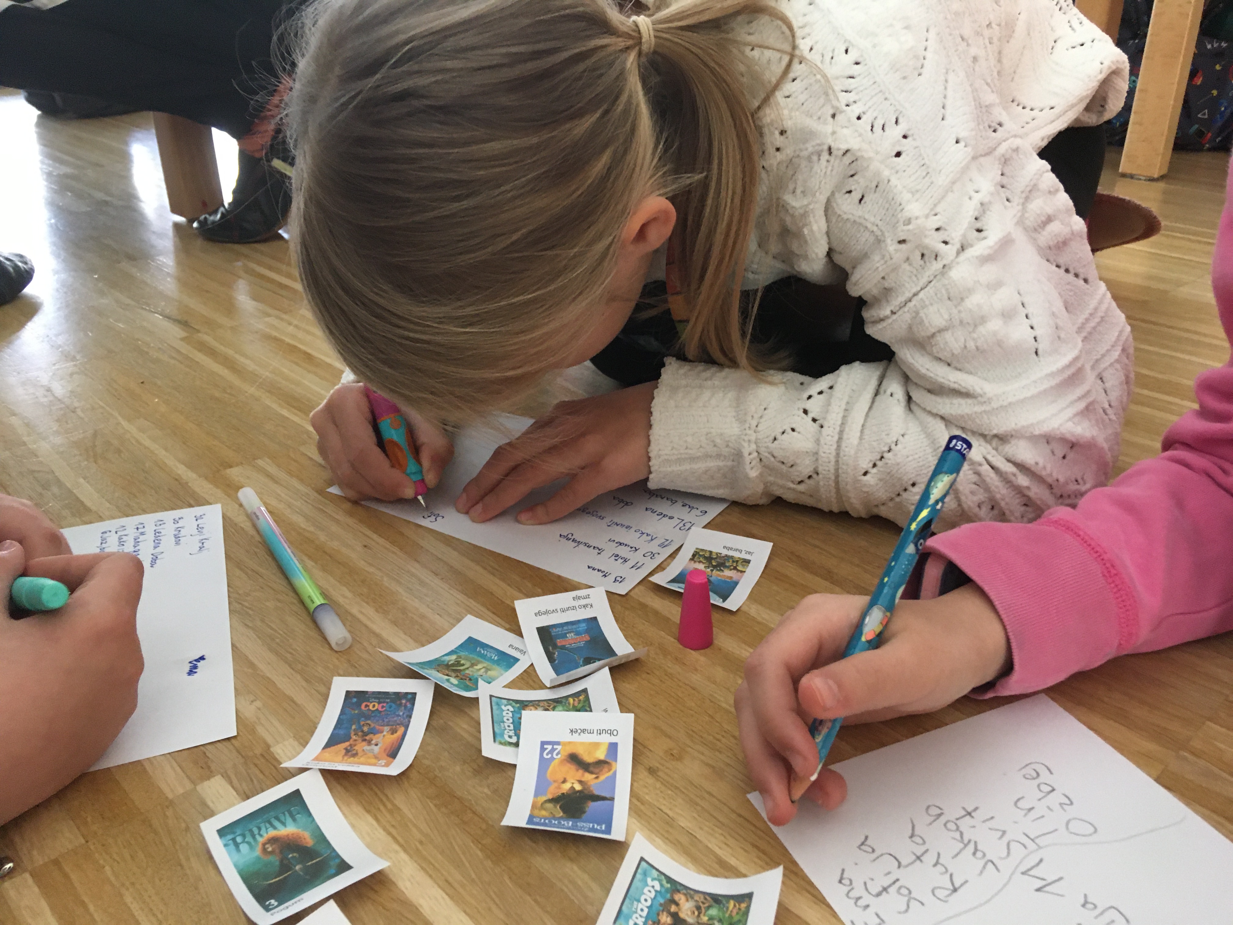 Učence razdelimo v skupine s približno 8 učenci. Vsaka skupina dobi list velikosti A3 (ali A2, če ga imamo pri roki) in kartice s slikami risank; za vsako lahko natisnemo dva kompleta, tako da se vsaka risanka pojavi dvakrat. Vsak učenec dobi list papirja (zadoščal bo A5).