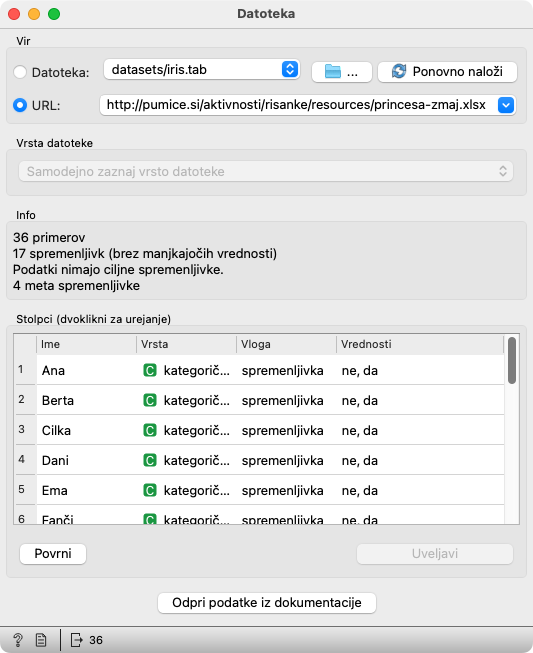 Za vajo doma lahko delate s testnimi podatki s te strani. Povezava nanje, https://pumice.si/risanke/resources/princesa-zmaj.xlsx, je že nastavljena v delotoku.