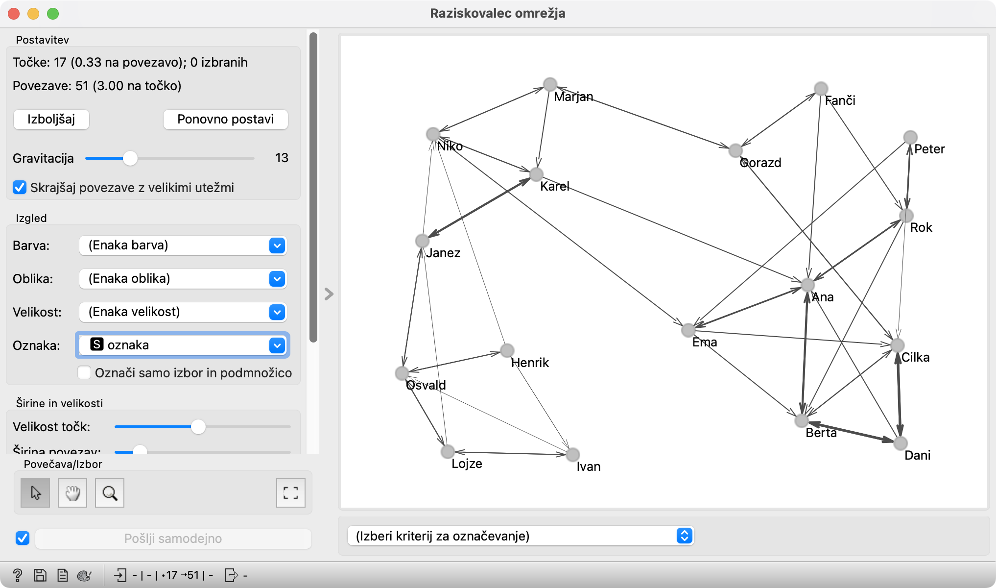 Pomembno je, da ne povezujemo najbolj podobnih učencev, temveč vsak učenec nariše povezave do treh. Na ta način se izognemo temu, da bi bil kak učenec sam zase, brez povezav.