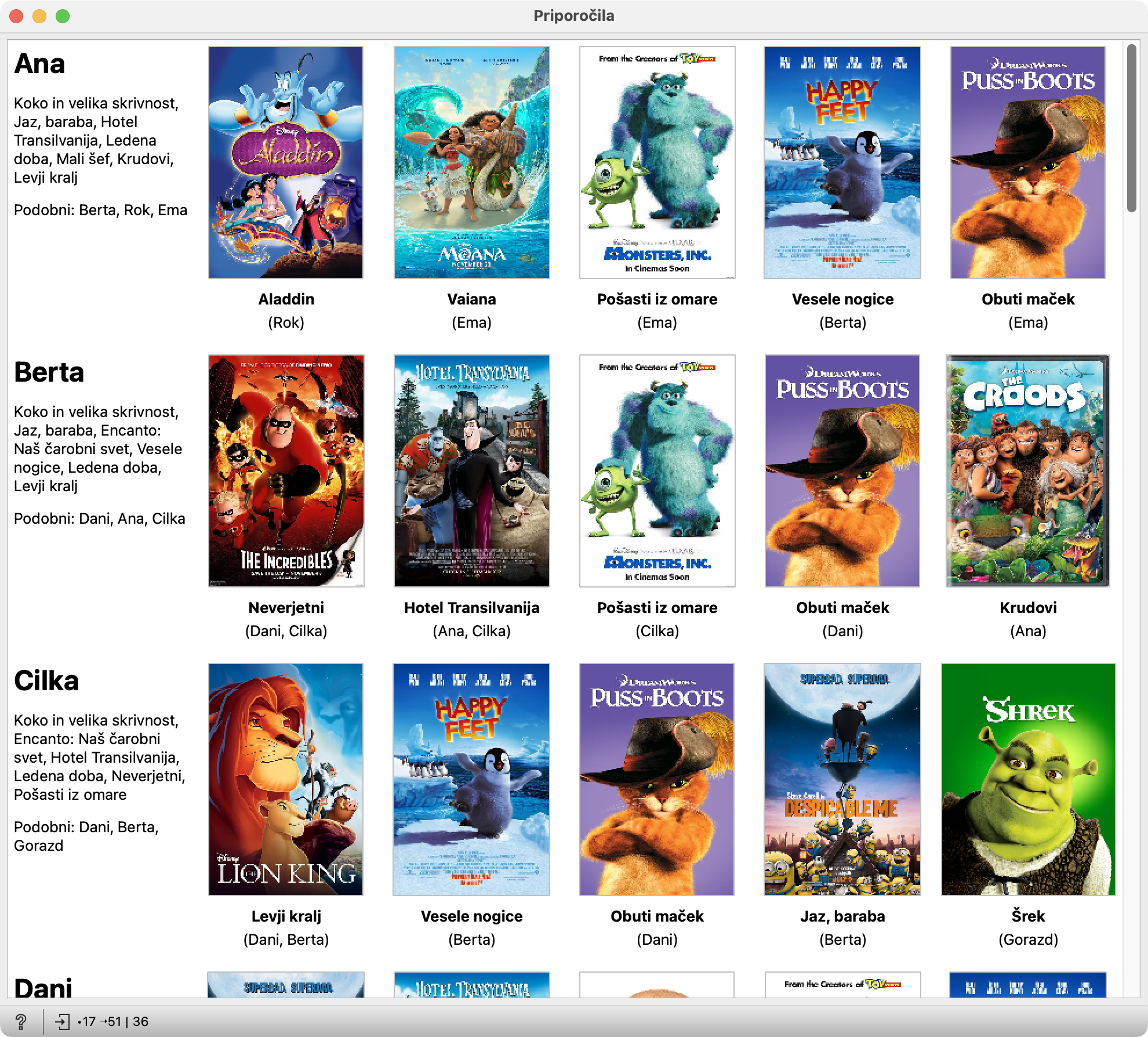 Za vsakega učenca vidimo, katere risanke je izbral in kdo v razredu je izbiral podobne risanke. Predvsem pa vsakemu pokaže priporočila, pod priporočilom pa je napisano, kateri izmed njemu podobnih sošolcev in sošolk je za to priporočilo “zaslužen”.