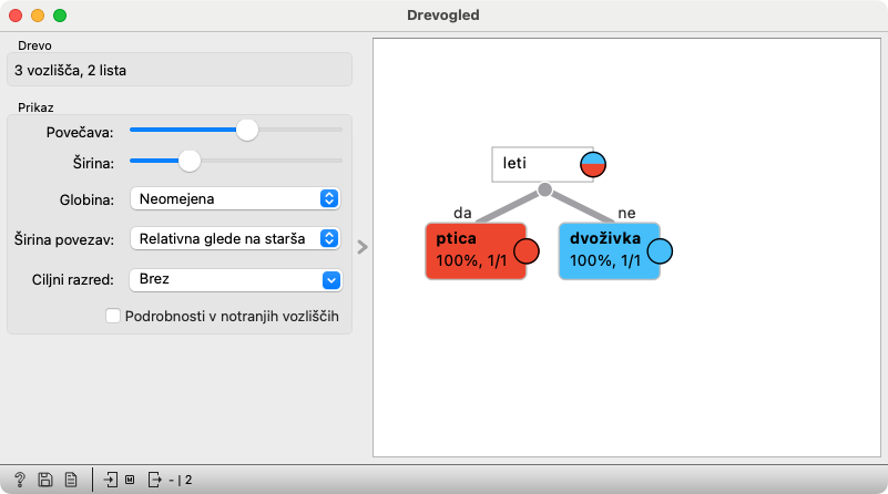 5. Z dvoklikom odpremo Drevogled. Računalnik je prišel do očitnega spoznanja: če žival leti, je ptica, sicer dvoživka. Prepričamo se, da učenci razumejo pomen drevesa.