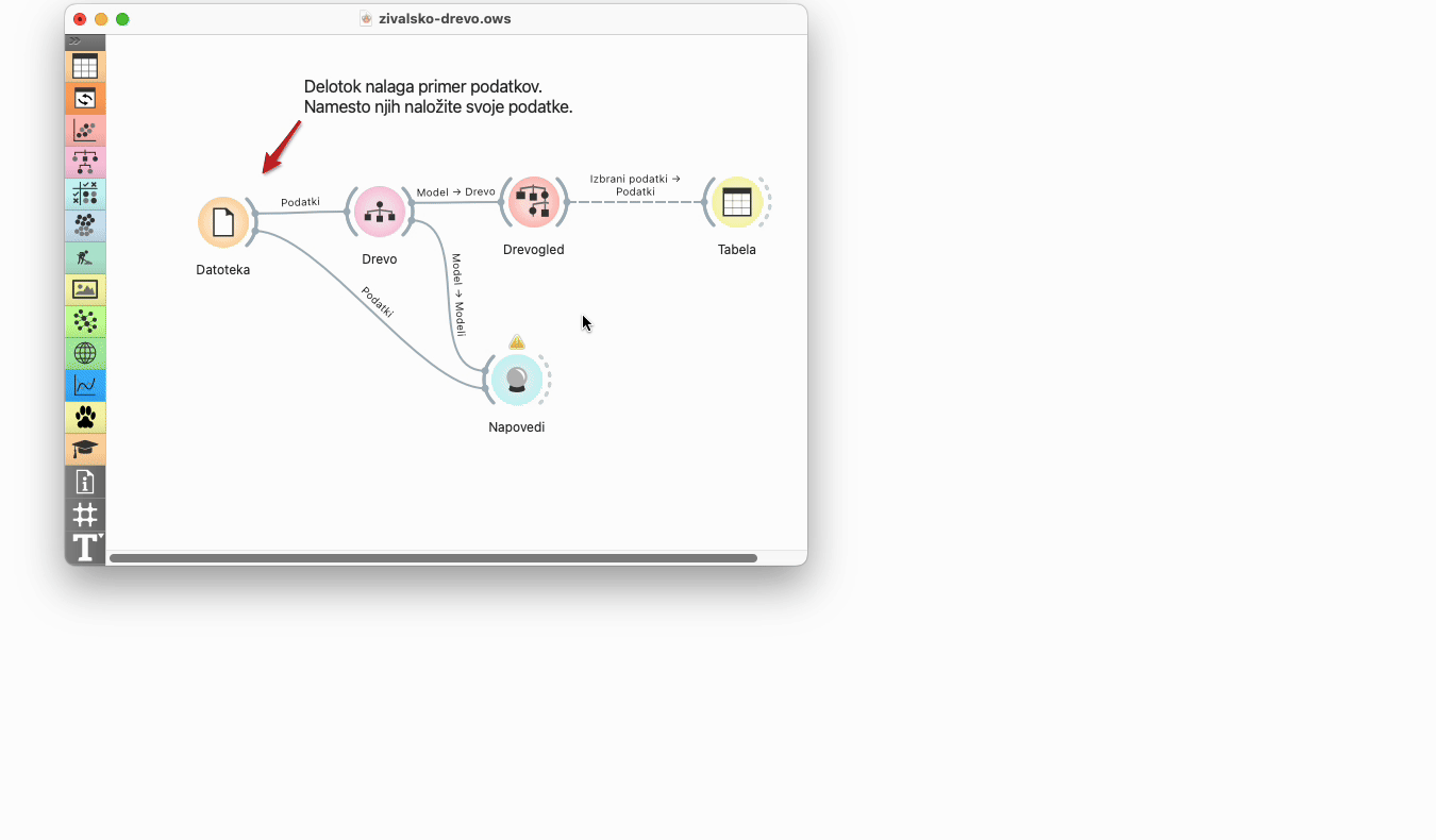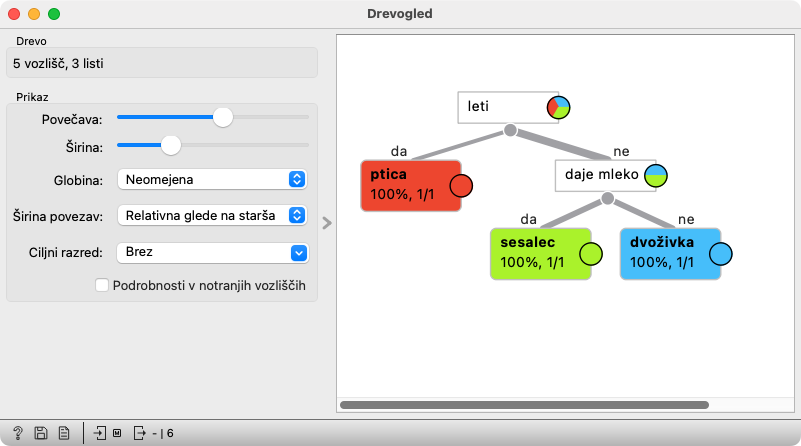 7. V Datoteka pritisnemo ponovno naloži. V Drevogledu preverimo drevo: vidimo, da neleteče živali zdaj ločuje glede na to, ali dajejo mleko ali ne.