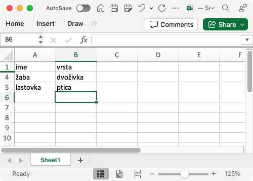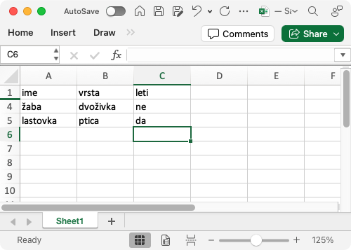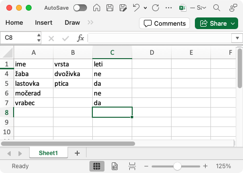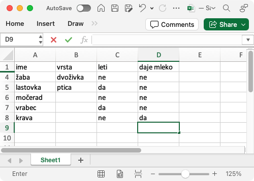 3. Učenci naj povedo, po čem bomo ločili dvoživke od ptic. Recimo, da so se odločili za to, ali žival leti ali ne. (Seveda bi bila primernejša lastnost perje; kokoši niso znane kot dobre letalke, pingvini pa še manj. Vendar ubogajmo predloge.) Dodamo nov stolpec: v C1 zapišemo “leti”, v C4 (vrstica z žabo) zapišemo “ne”, v C5 (lastovka) pa “da”.