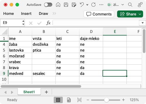 V Excelu torej dodamo medveda, povemo, da je sesalec, ki ne leti (samo še tega, da nas napade leteči medved, se nam manjka) in da daje mleko (vsaj teoretično). Shranimo.