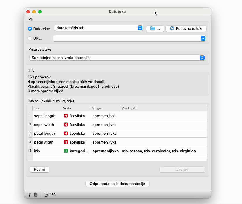 Pritisnemo na tipko za odpiranje datoteke (desno od vnosne vrstice z imenom datoteke) in odpremo Excelovo datoteko, ki smo jo pravkar sestavili.