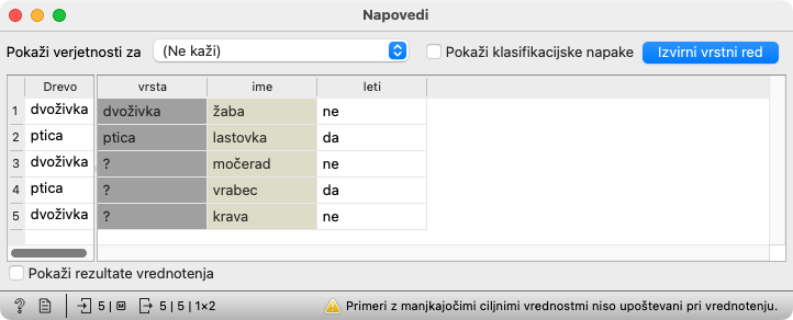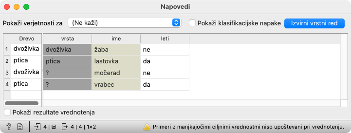 7. Odpremo gradnik Napovedi. V njem vidimo vse štiri živali. V desnem delu so podatki, v levem stolpcu pa napovedi drevesa. Da sta žaba in lastovka dvoživka in ptica, je bilo že podano. Kaj sta močerad in vrabec, pa je računalnik s pomočjo drevesa sklepal po tem, da prvi ne leta, drugi pa.